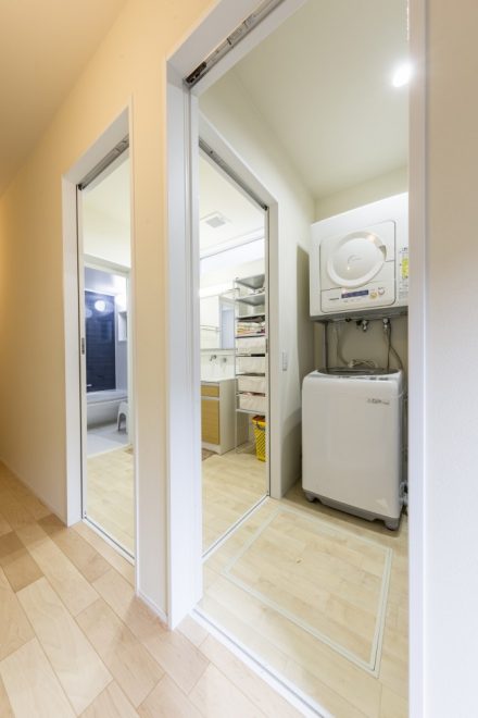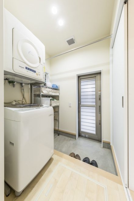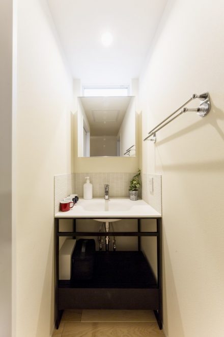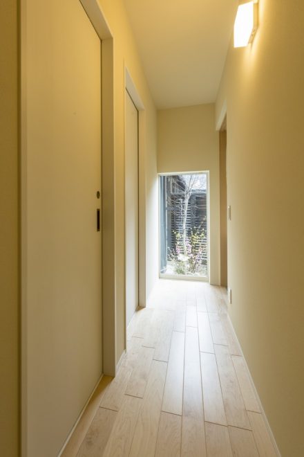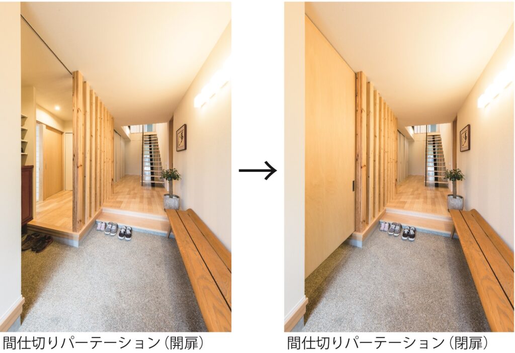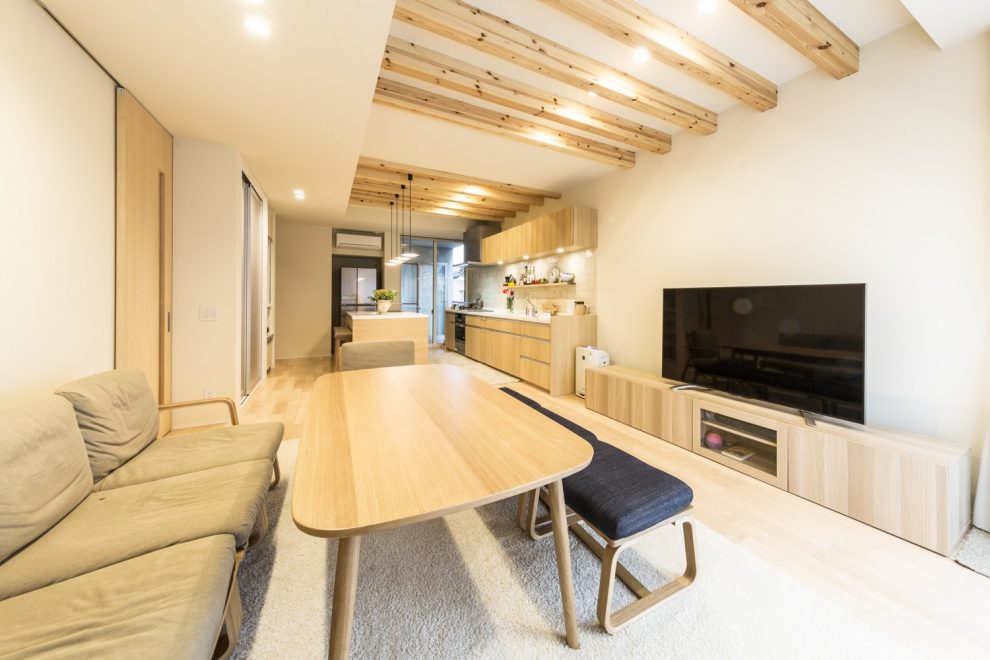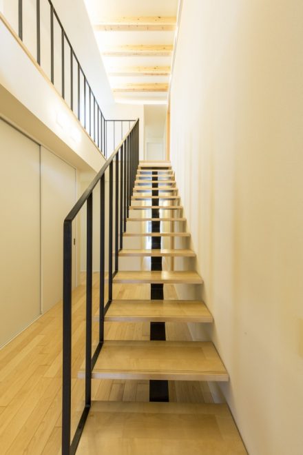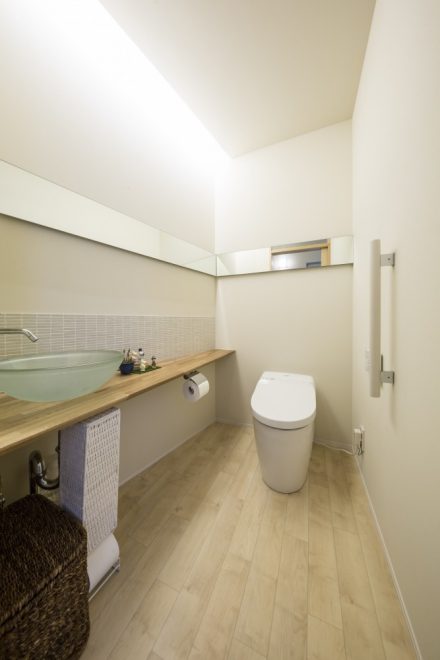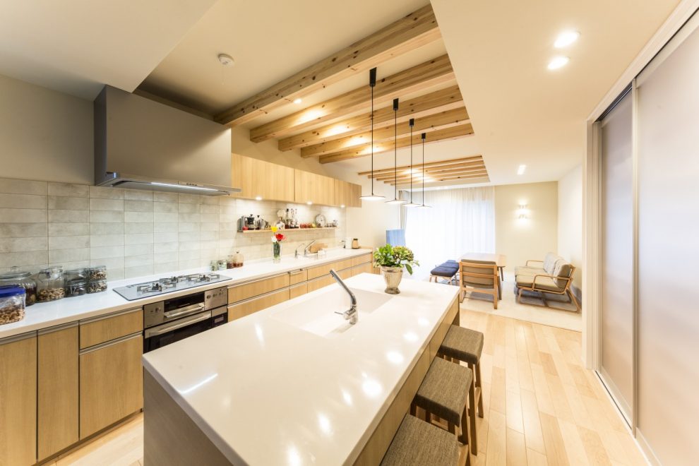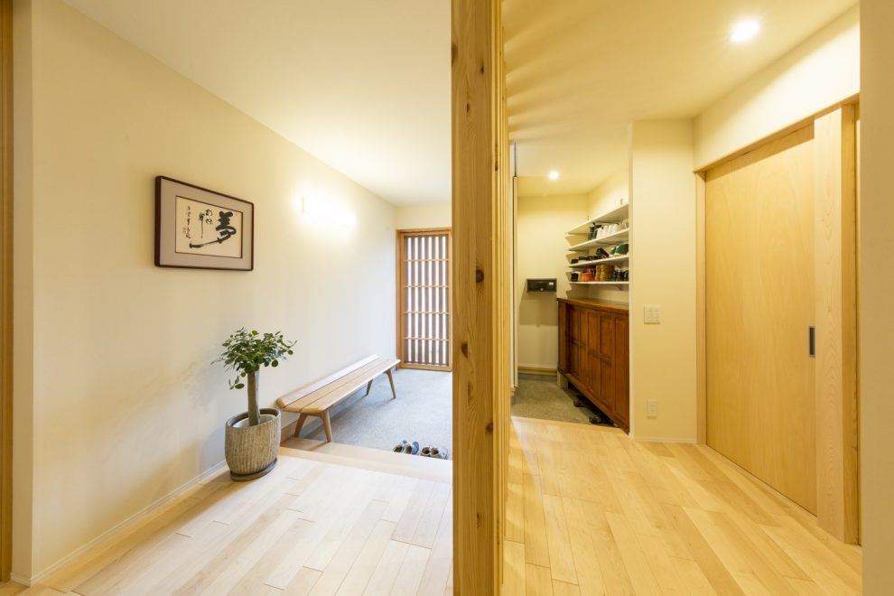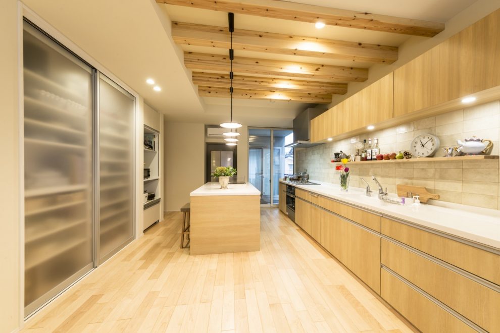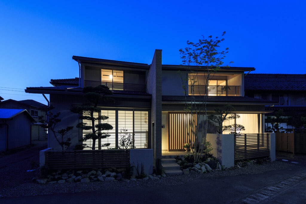 中山道沿いに佇むこちらは、玄関建具とバルコニーの横格子、窓庇の自然素材を使用し温かみのある外観に仕上がりました。二世帯住宅ということもあり、玄関をはじめLDK、水回り等、ゆったりとしたスペースと収納部分を充実させました。特にキッチンは、ご家族の皆さんがお料理をされるということで2シンク設け、作業スペースもしっかり確保しました。三世代がそれぞれ楽しく過ごせる家づくりを実現しました。